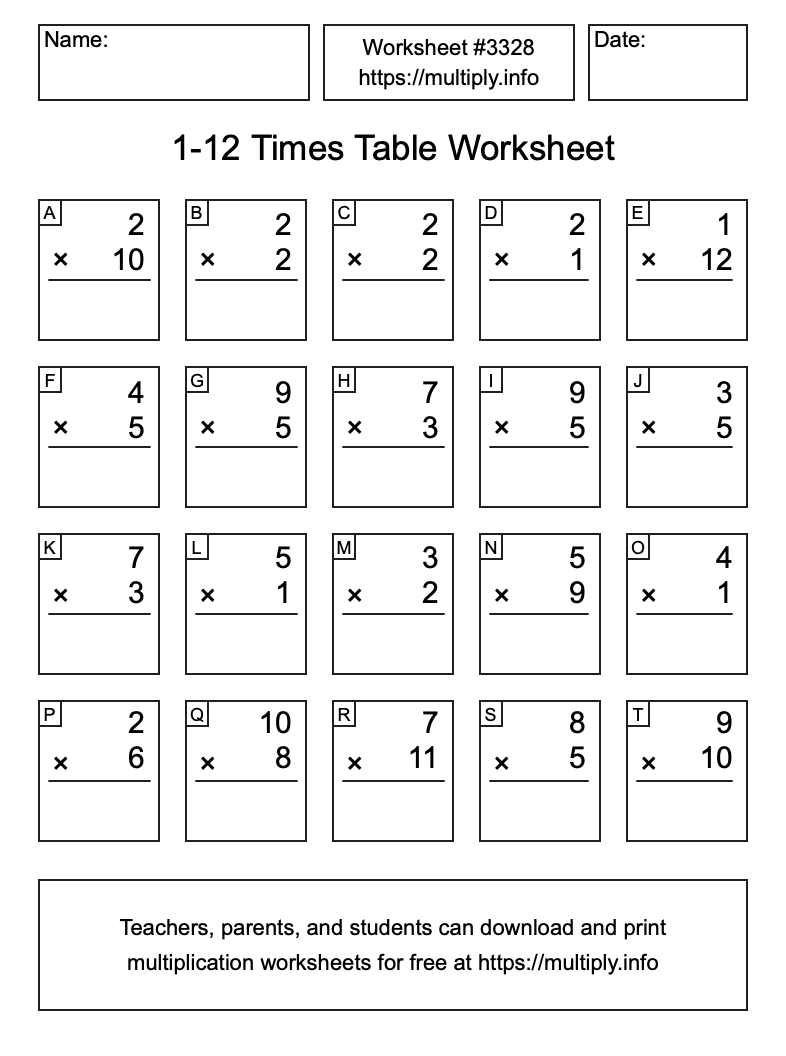 Here is the 1 to 12 Times Table Worksheet #3328. This worksheet contains problems related to the multiplication tables of 1 through 12. Print and/or save the worksheet using the buttons below the image. You can also drag or right-click on the image to download it to your device.