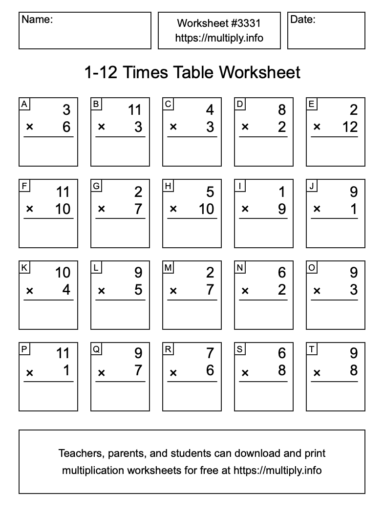 Here is the 1 to 12 Times Table Worksheet #3331. This worksheet contains problems related to the multiplication tables of 1 through 12. Print and/or save the worksheet using the buttons below the image. You can also drag or right-click on the image to download it to your device.