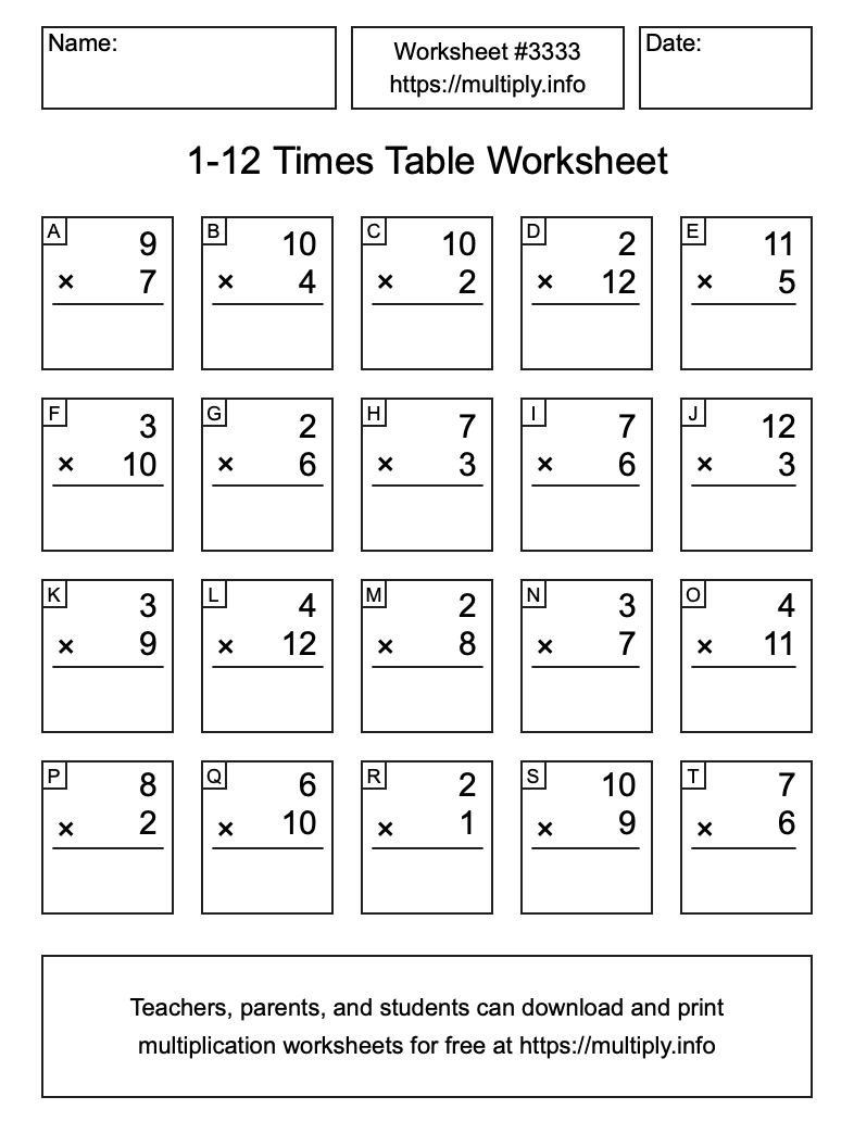 Here is the 1 to 12 Times Table Worksheet #3333. This worksheet contains problems related to the multiplication tables of 1 through 12. Print and/or save the worksheet using the buttons below the image. You can also drag or right-click on the image to download it to your device.