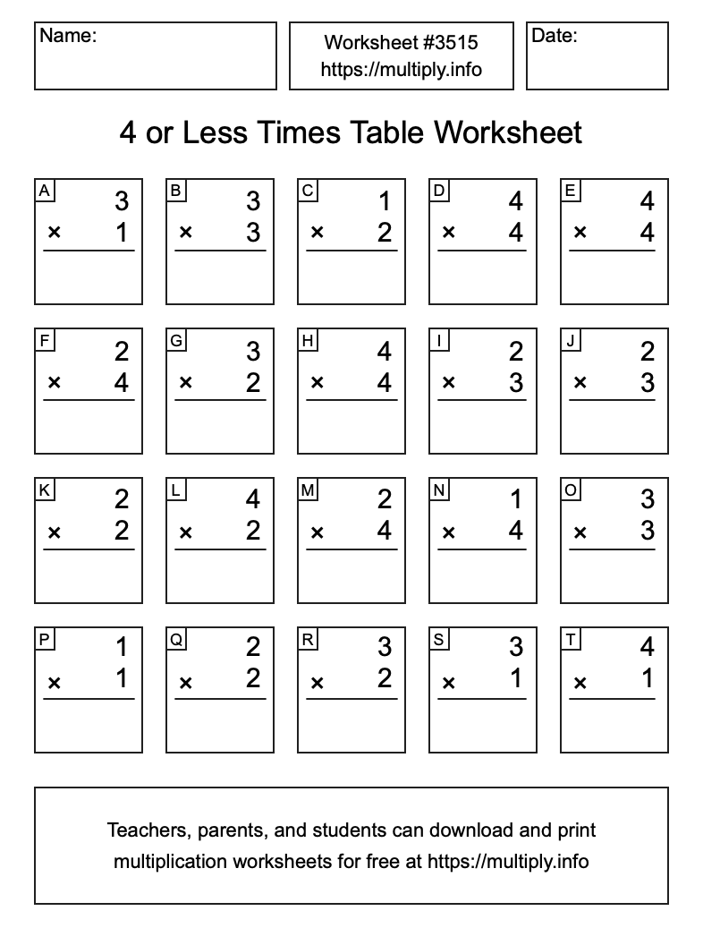 Here is the 4 or less Times Table Worksheet #3515. This worksheet contains multiplication problems where every number in every problem is less than or equal to 4. Print and/or save the worksheet using the buttons below the image. You can also drag or right-click on the image to download it to your device.