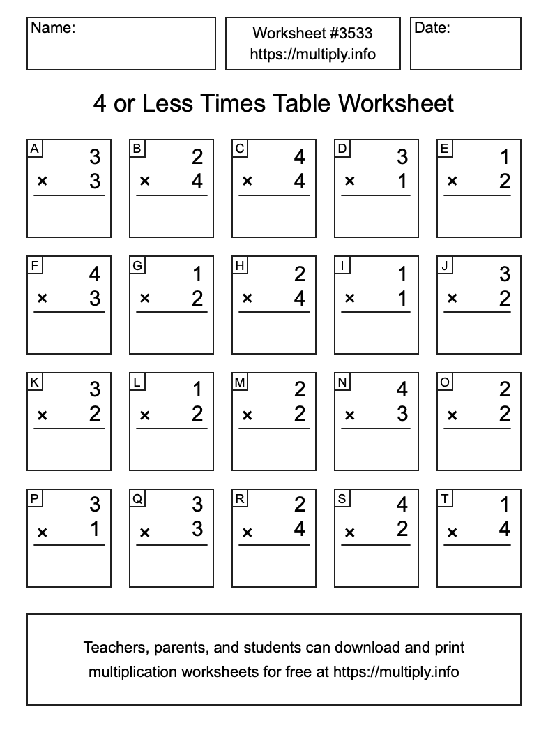 Here is the 4 or less Times Table Worksheet #3533. This worksheet contains multiplication problems where every number in every problem is less than or equal to 4. Print and/or save the worksheet using the buttons below the image. You can also drag or right-click on the image to download it to your device.