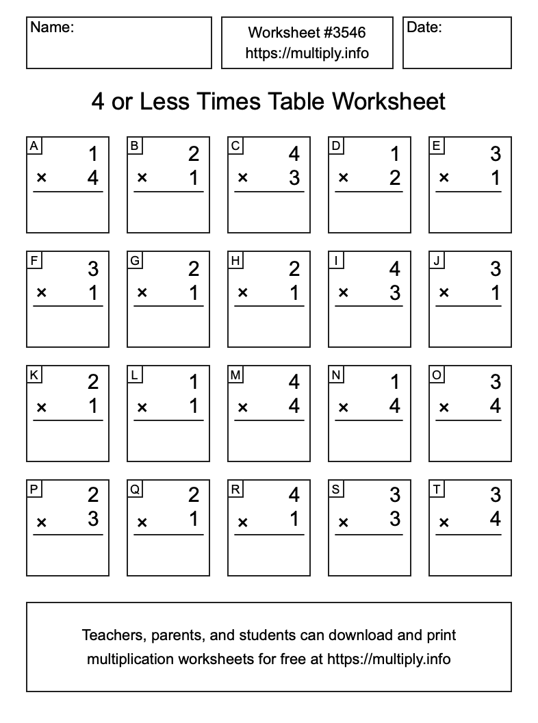 Here is the 4 or less Times Table Worksheet #3546. This worksheet contains multiplication problems where every number in every problem is less than or equal to 4. Print and/or save the worksheet using the buttons below the image. You can also drag or right-click on the image to download it to your device.