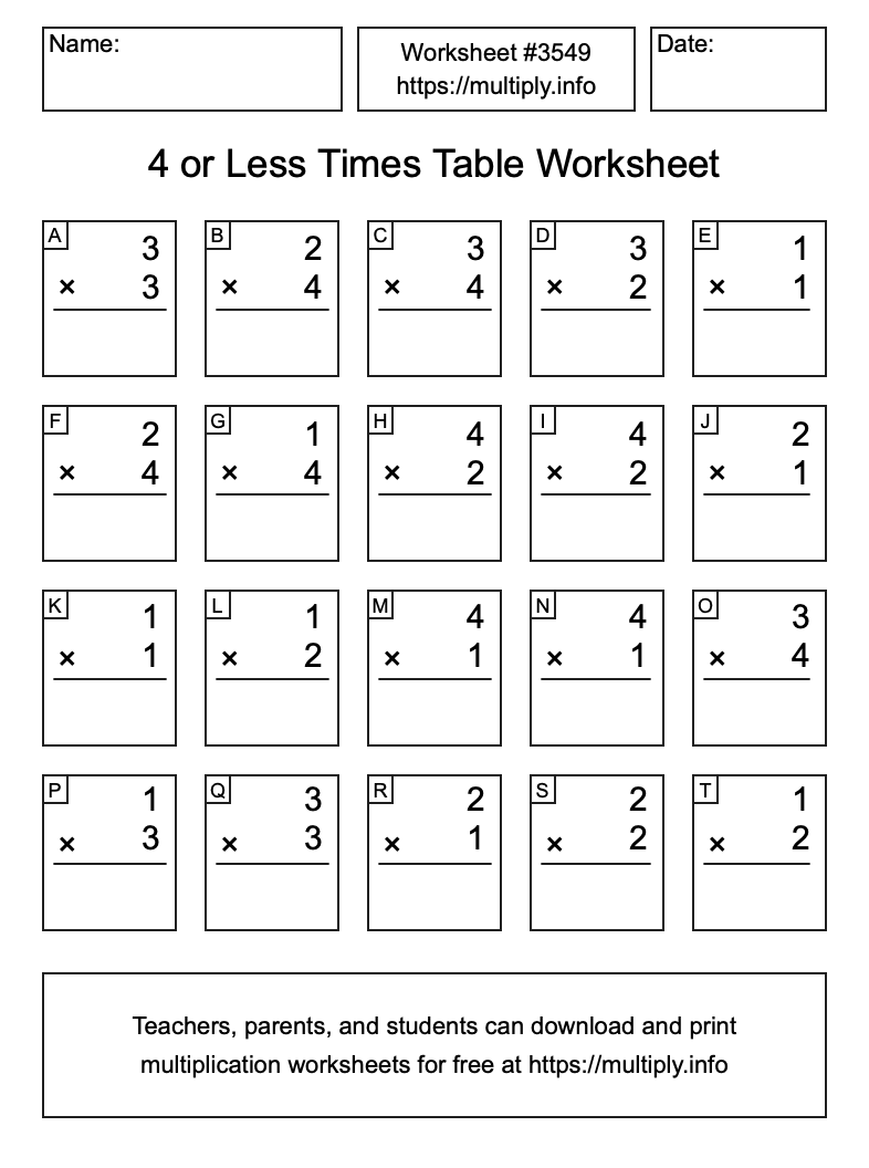 Here is the 4 or less Times Table Worksheet #3549. This worksheet contains multiplication problems where every number in every problem is less than or equal to 4. Print and/or save the worksheet using the buttons below the image. You can also drag or right-click on the image to download it to your device.