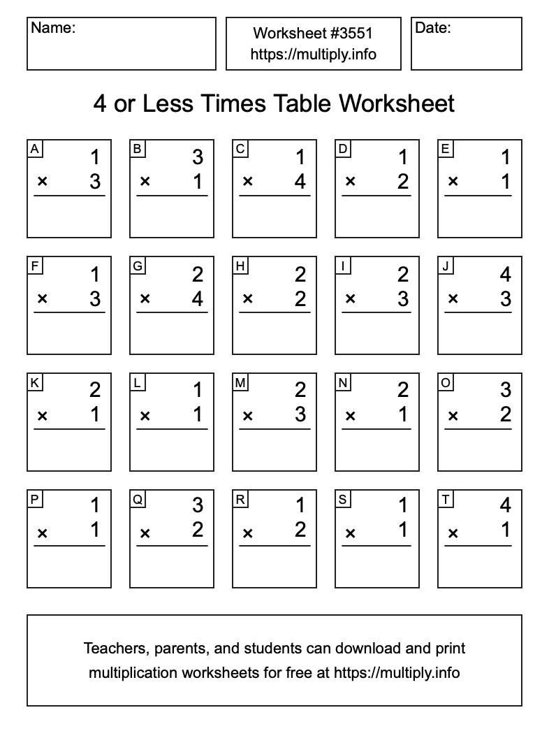 Here is the 4 or less Times Table Worksheet #3551. This worksheet contains multiplication problems where every number in every problem is less than or equal to 4. Print and/or save the worksheet using the buttons below the image. You can also drag or right-click on the image to download it to your device.