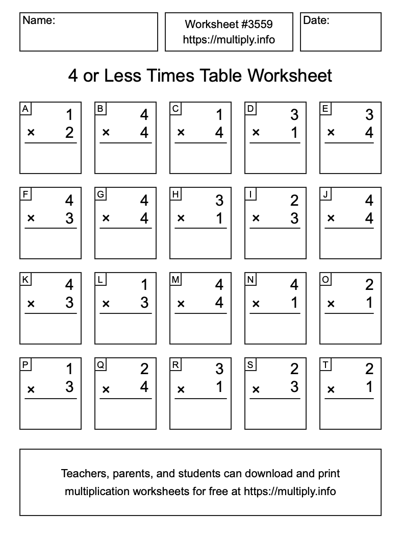 Here is the 4 or less Times Table Worksheet #3559. This worksheet contains multiplication problems where every number in every problem is less than or equal to 4. Print and/or save the worksheet using the buttons below the image. You can also drag or right-click on the image to download it to your device.