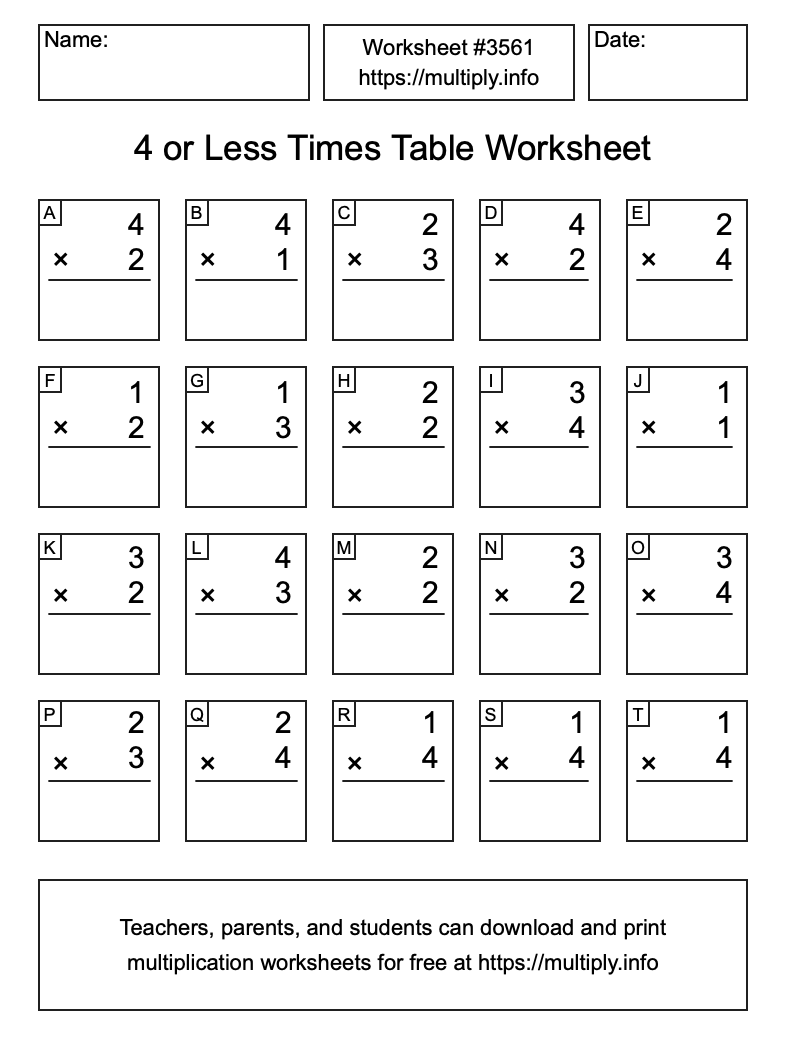 Here is the 4 or less Times Table Worksheet #3561. This worksheet contains multiplication problems where every number in every problem is less than or equal to 4. Print and/or save the worksheet using the buttons below the image. You can also drag or right-click on the image to download it to your device.