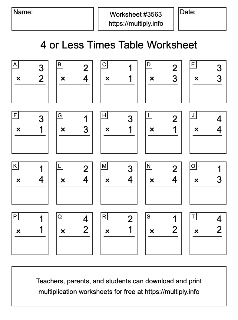 Here is the 4 or less Times Table Worksheet #3563. This worksheet contains multiplication problems where every number in every problem is less than or equal to 4. Print and/or save the worksheet using the buttons below the image. You can also drag or right-click on the image to download it to your device.