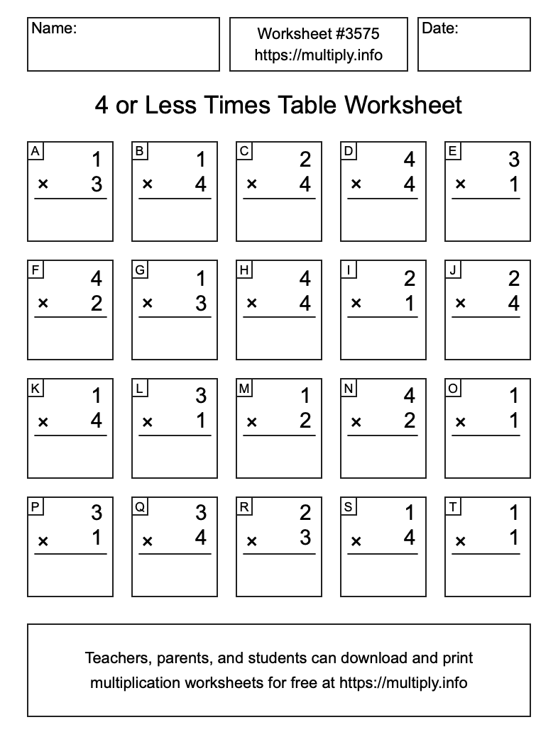 Here is the 4 or less Times Table Worksheet #3575. This worksheet contains multiplication problems where every number in every problem is less than or equal to 4. Print and/or save the worksheet using the buttons below the image. You can also drag or right-click on the image to download it to your device.