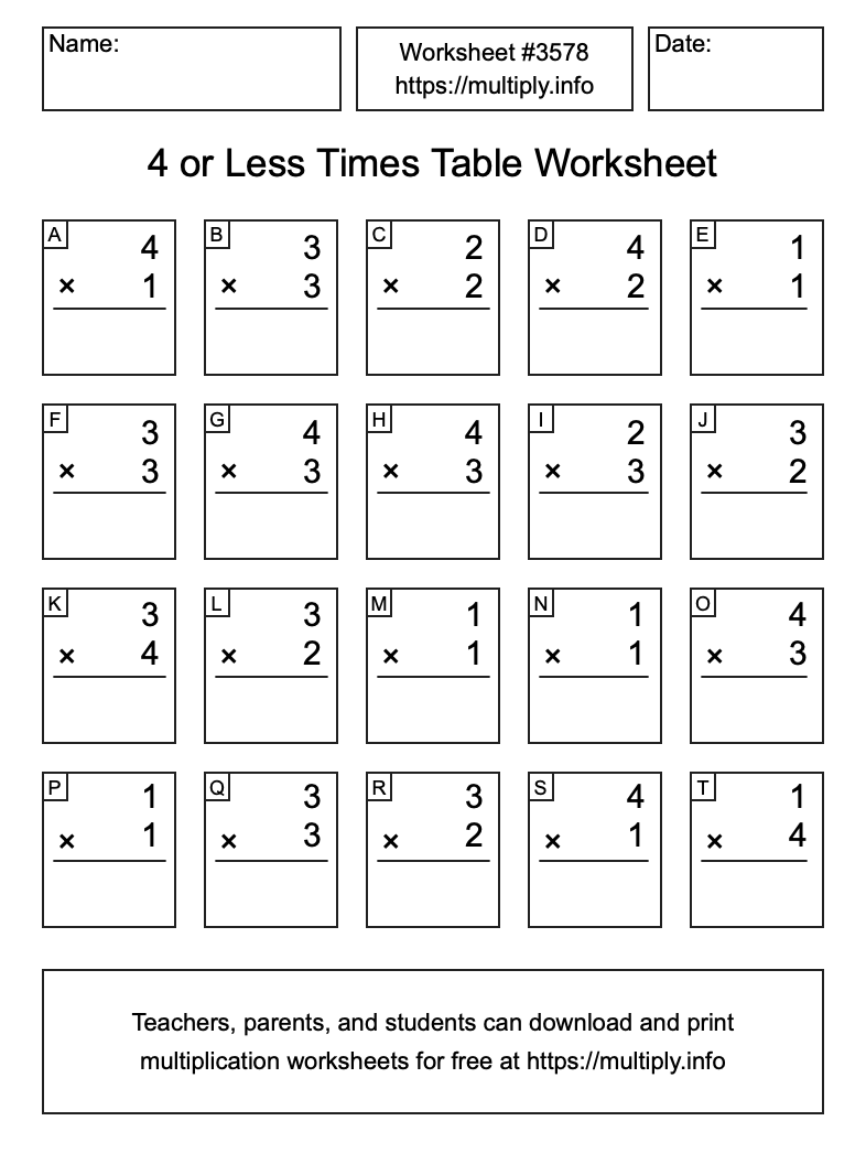 Here is the 4 or less Times Table Worksheet #3578. This worksheet contains multiplication problems where every number in every problem is less than or equal to 4. Print and/or save the worksheet using the buttons below the image. You can also drag or right-click on the image to download it to your device.