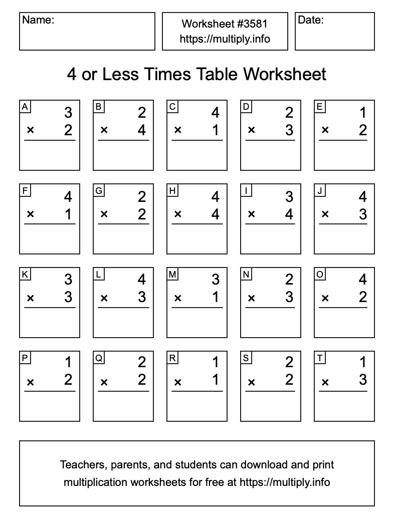 Here is the 4 or less Times Table Worksheet #3581. This worksheet contains multiplication problems where every number in every problem is less than or equal to 4. Print and/or save the worksheet using the buttons below the image. You can also drag or right-click on the image to download it to your device.