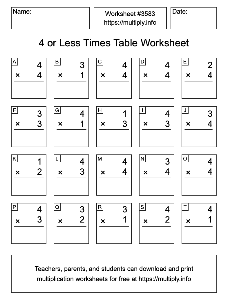 Here is the 4 or less Times Table Worksheet #3583. This worksheet contains multiplication problems where every number in every problem is less than or equal to 4. Print and/or save the worksheet using the buttons below the image. You can also drag or right-click on the image to download it to your device.