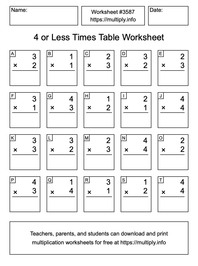 Here is the 4 or less Times Table Worksheet #3587. This worksheet contains multiplication problems where every number in every problem is less than or equal to 4. Print and/or save the worksheet using the buttons below the image. You can also drag or right-click on the image to download it to your device.