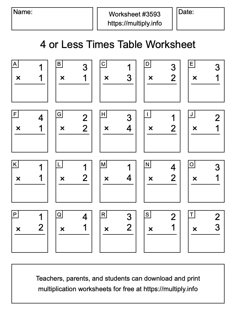 Here is the 4 or less Times Table Worksheet #3593. This worksheet contains multiplication problems where every number in every problem is less than or equal to 4. Print and/or save the worksheet using the buttons below the image. You can also drag or right-click on the image to download it to your device.