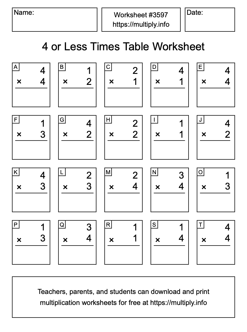 Here is the 4 or less Times Table Worksheet #3597. This worksheet contains multiplication problems where every number in every problem is less than or equal to 4. Print and/or save the worksheet using the buttons below the image. You can also drag or right-click on the image to download it to your device.