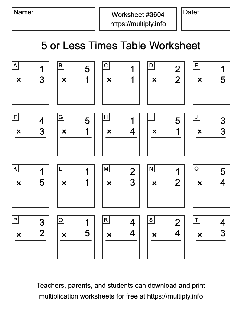 Here is the 5 or less Times Table Worksheet #3604. This worksheet contains multiplication problems where every number in every problem is less than or equal to 5. Print and/or save the worksheet using the buttons below the image. You can also drag or right-click on the image to download it to your device.