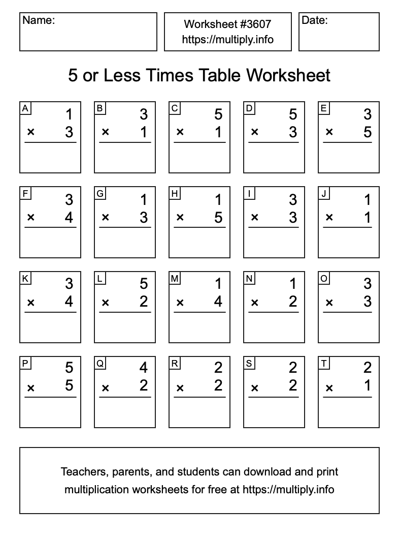 Here is the 5 or less Times Table Worksheet #3607. This worksheet contains multiplication problems where every number in every problem is less than or equal to 5. Print and/or save the worksheet using the buttons below the image. You can also drag or right-click on the image to download it to your device.