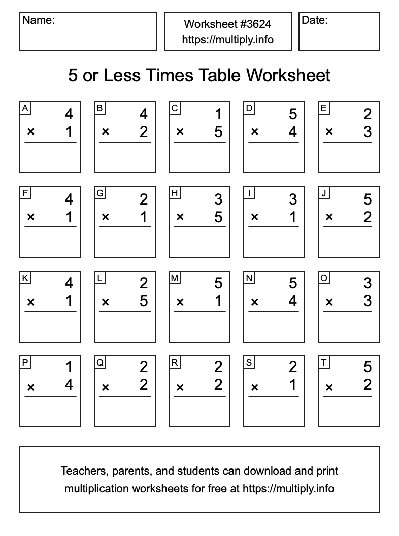 Here is the 5 or less Times Table Worksheet #3624. This worksheet contains multiplication problems where every number in every problem is less than or equal to 5. Print and/or save the worksheet using the buttons below the image. You can also drag or right-click on the image to download it to your device.