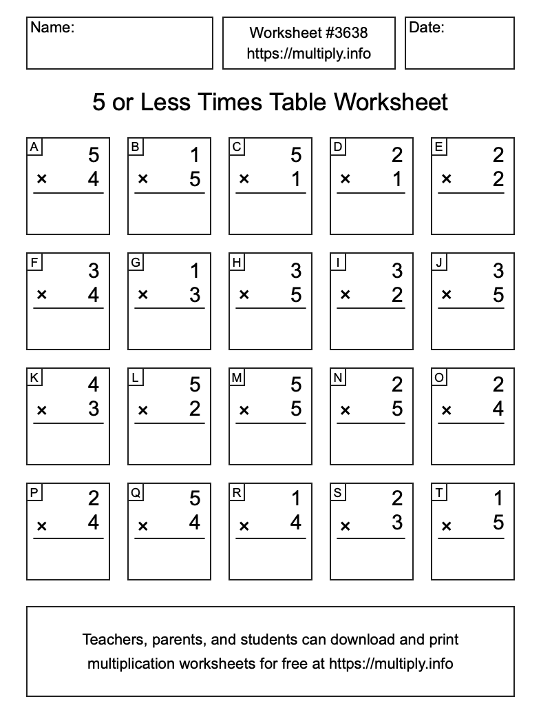 Here is the 5 or less Times Table Worksheet #3638. This worksheet contains multiplication problems where every number in every problem is less than or equal to 5. Print and/or save the worksheet using the buttons below the image. You can also drag or right-click on the image to download it to your device.