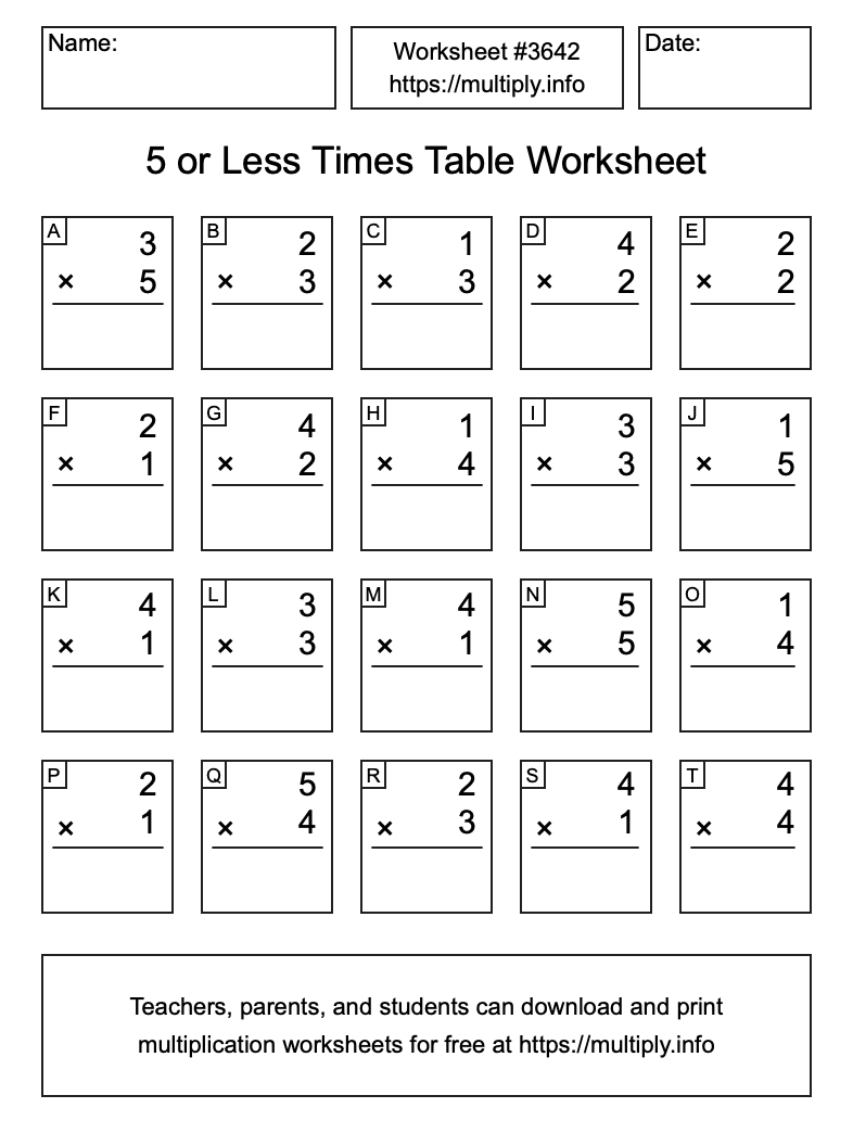 Here is the 5 or less Times Table Worksheet #3642. This worksheet contains multiplication problems where every number in every problem is less than or equal to 5. Print and/or save the worksheet using the buttons below the image. You can also drag or right-click on the image to download it to your device.