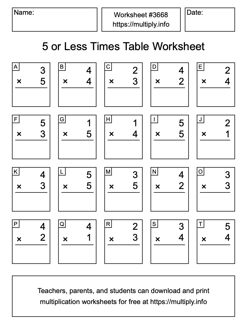 Here is the 5 or less Times Table Worksheet #3668. This worksheet contains multiplication problems where every number in every problem is less than or equal to 5. Print and/or save the worksheet using the buttons below the image. You can also drag or right-click on the image to download it to your device.