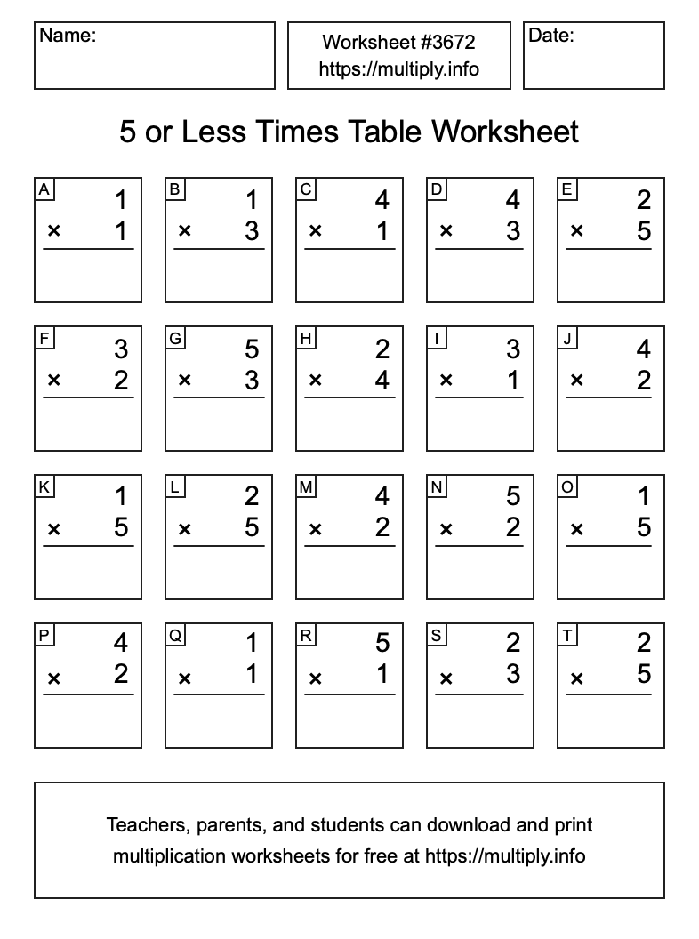Here is the 5 or less Times Table Worksheet #3672. This worksheet contains multiplication problems where every number in every problem is less than or equal to 5. Print and/or save the worksheet using the buttons below the image. You can also drag or right-click on the image to download it to your device.