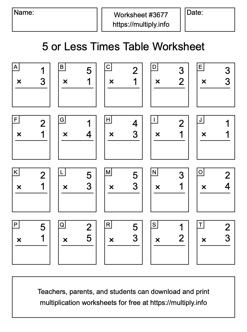 Here is the 5 or less Times Table Worksheet #3677. This worksheet contains multiplication problems where every number in every problem is less than or equal to 5. Print and/or save the worksheet using the buttons below the image. You can also drag or right-click on the image to download it to your device.