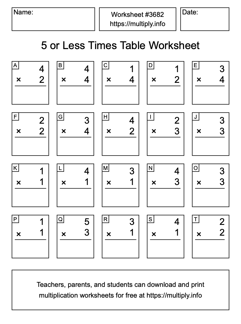 5 or less Times Table Worksheet #3683