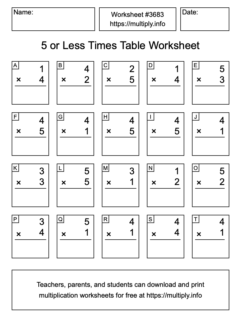 Here is the 5 or less Times Table Worksheet #3683. This worksheet contains multiplication problems where every number in every problem is less than or equal to 5. Print and/or save the worksheet using the buttons below the image. You can also drag or right-click on the image to download it to your device.