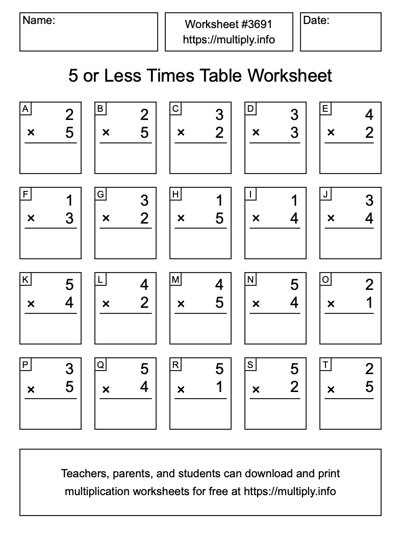 Here is the 5 or less Times Table Worksheet #3691. This worksheet contains multiplication problems where every number in every problem is less than or equal to 5. Print and/or save the worksheet using the buttons below the image. You can also drag or right-click on the image to download it to your device.