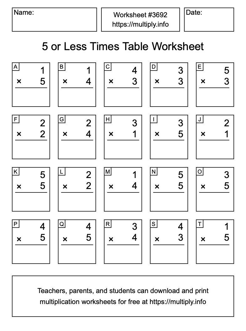 Here is the 5 or less Times Table Worksheet #3692. This worksheet contains multiplication problems where every number in every problem is less than or equal to 5. Print and/or save the worksheet using the buttons below the image. You can also drag or right-click on the image to download it to your device.