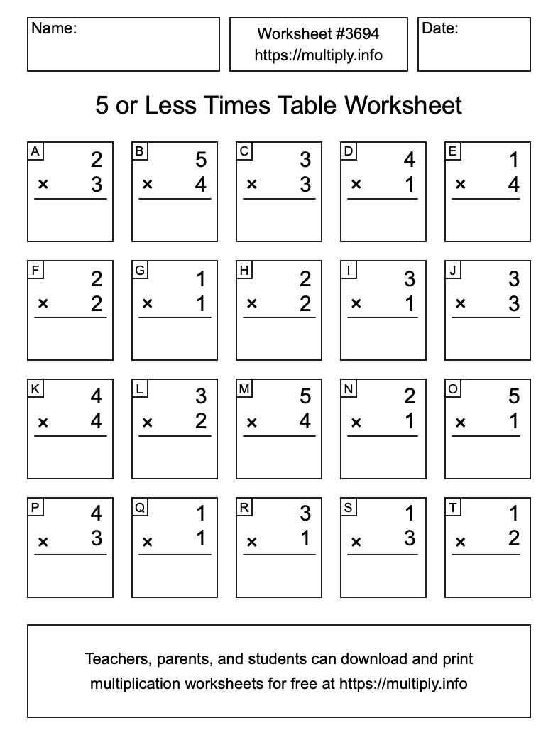 Here is the 5 or less Times Table Worksheet #3694. This worksheet contains multiplication problems where every number in every problem is less than or equal to 5. Print and/or save the worksheet using the buttons below the image. You can also drag or right-click on the image to download it to your device.