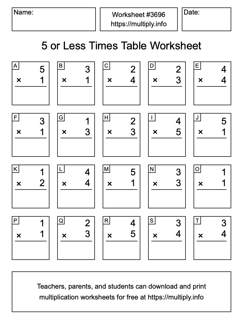 Here is the 5 or less Times Table Worksheet #3696. This worksheet contains multiplication problems where every number in every problem is less than or equal to 5. Print and/or save the worksheet using the buttons below the image. You can also drag or right-click on the image to download it to your device.