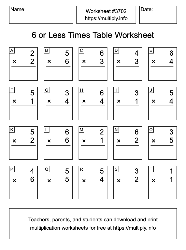 Here is the 6 or less Times Table Worksheet #3702. This worksheet contains multiplication problems where every number in every problem is less than or equal to 6. Print and/or save the worksheet using the buttons below the image. You can also drag or right-click on the image to download it to your device.