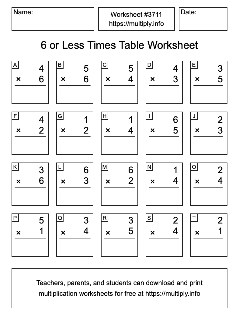 Here is the 6 or less Times Table Worksheet #3711. This worksheet contains multiplication problems where every number in every problem is less than or equal to 6. Print and/or save the worksheet using the buttons below the image. You can also drag or right-click on the image to download it to your device.
