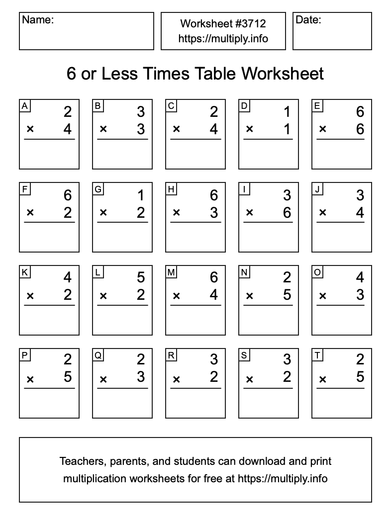 Here is the 6 or less Times Table Worksheet #3712. This worksheet contains multiplication problems where every number in every problem is less than or equal to 6. Print and/or save the worksheet using the buttons below the image. You can also drag or right-click on the image to download it to your device.