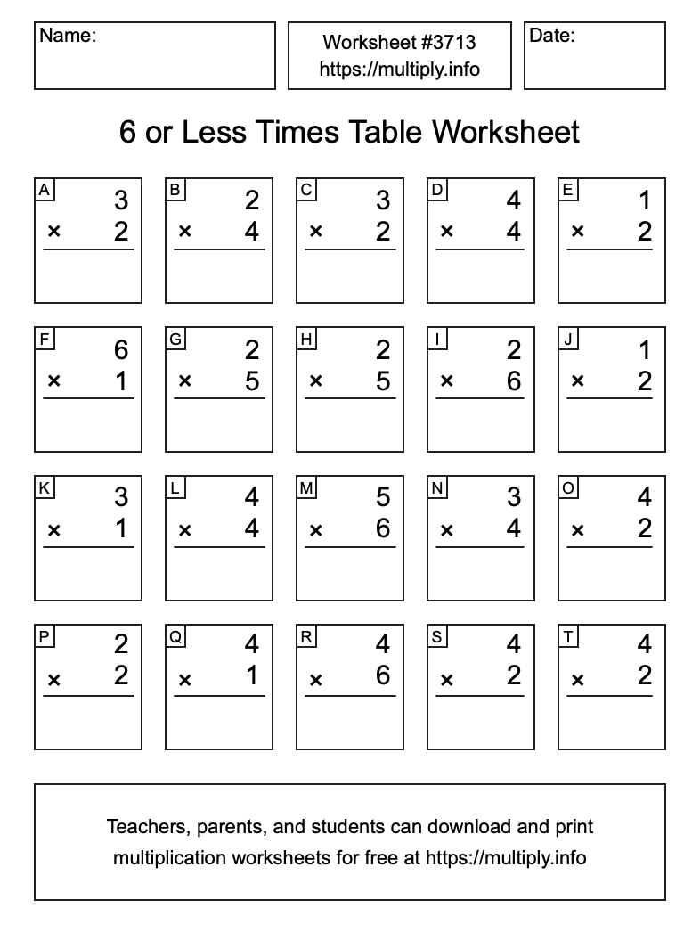 Here is the 6 or less Times Table Worksheet #3713. This worksheet contains multiplication problems where every number in every problem is less than or equal to 6. Print and/or save the worksheet using the buttons below the image. You can also drag or right-click on the image to download it to your device.