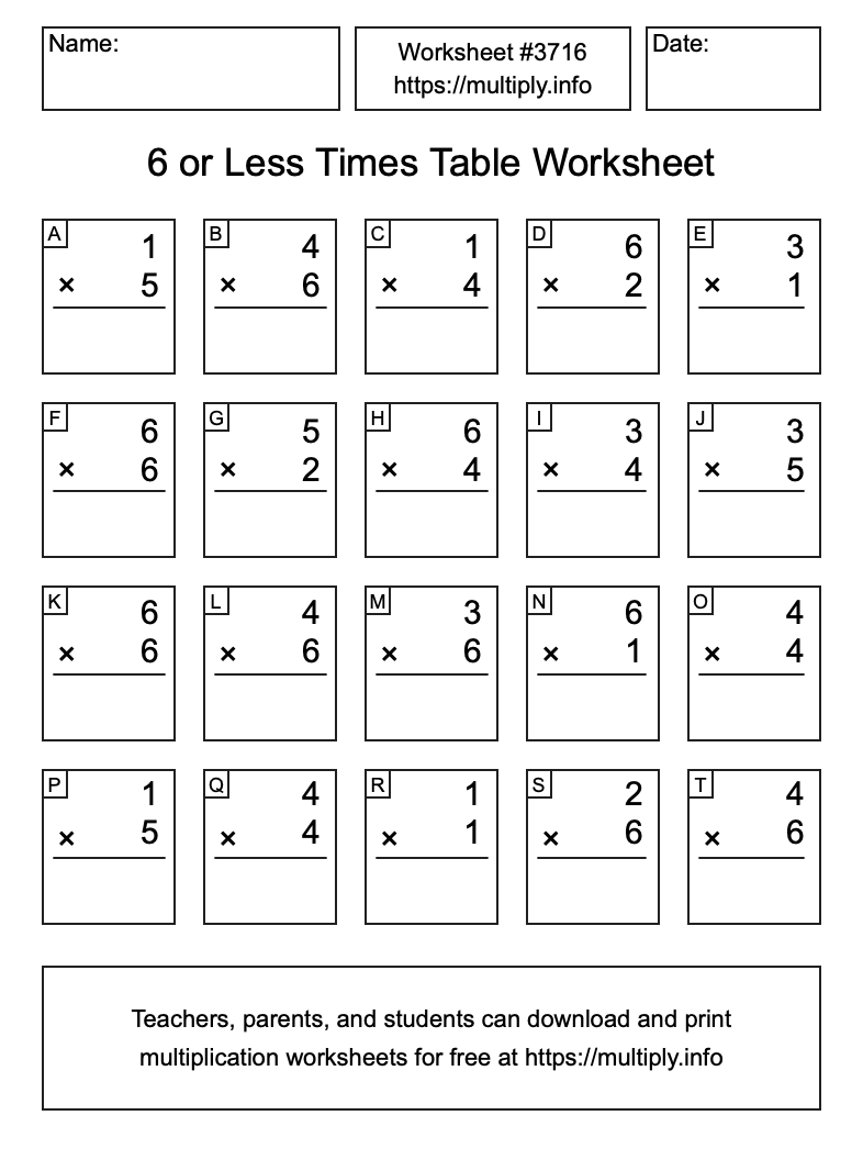 Here is the 6 or less Times Table Worksheet #3716. This worksheet contains multiplication problems where every number in every problem is less than or equal to 6. Print and/or save the worksheet using the buttons below the image. You can also drag or right-click on the image to download it to your device.
