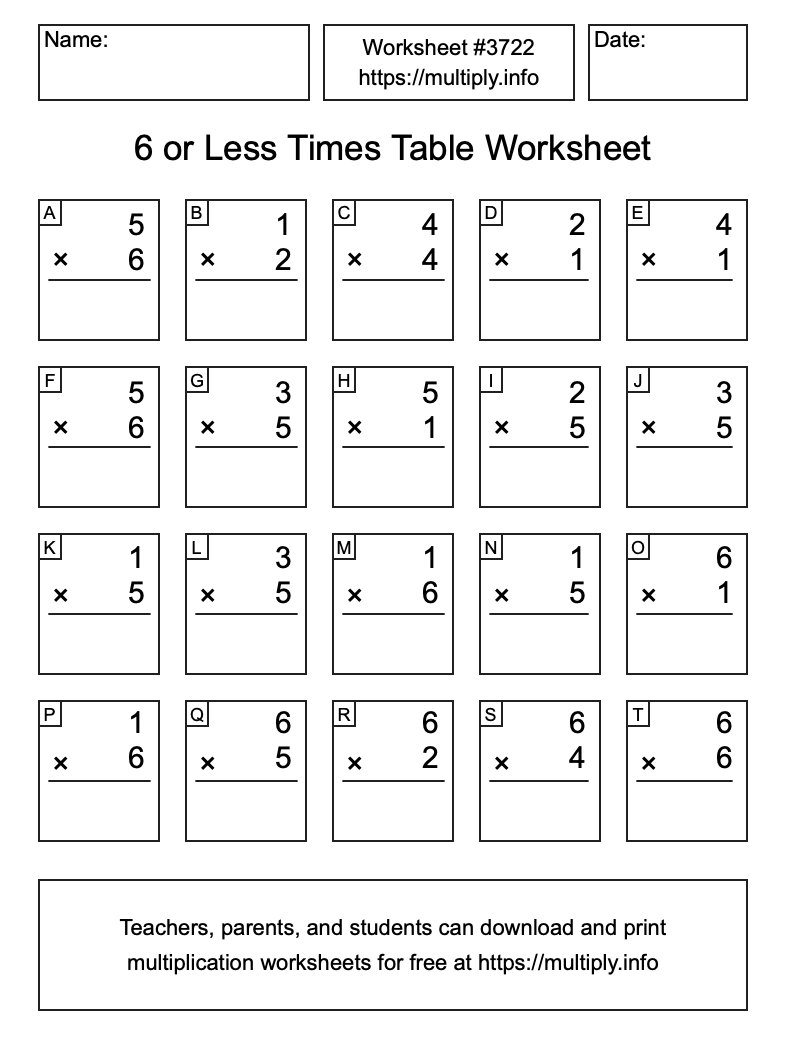 Here is the 6 or less Times Table Worksheet #3722. This worksheet contains multiplication problems where every number in every problem is less than or equal to 6. Print and/or save the worksheet using the buttons below the image. You can also drag or right-click on the image to download it to your device.