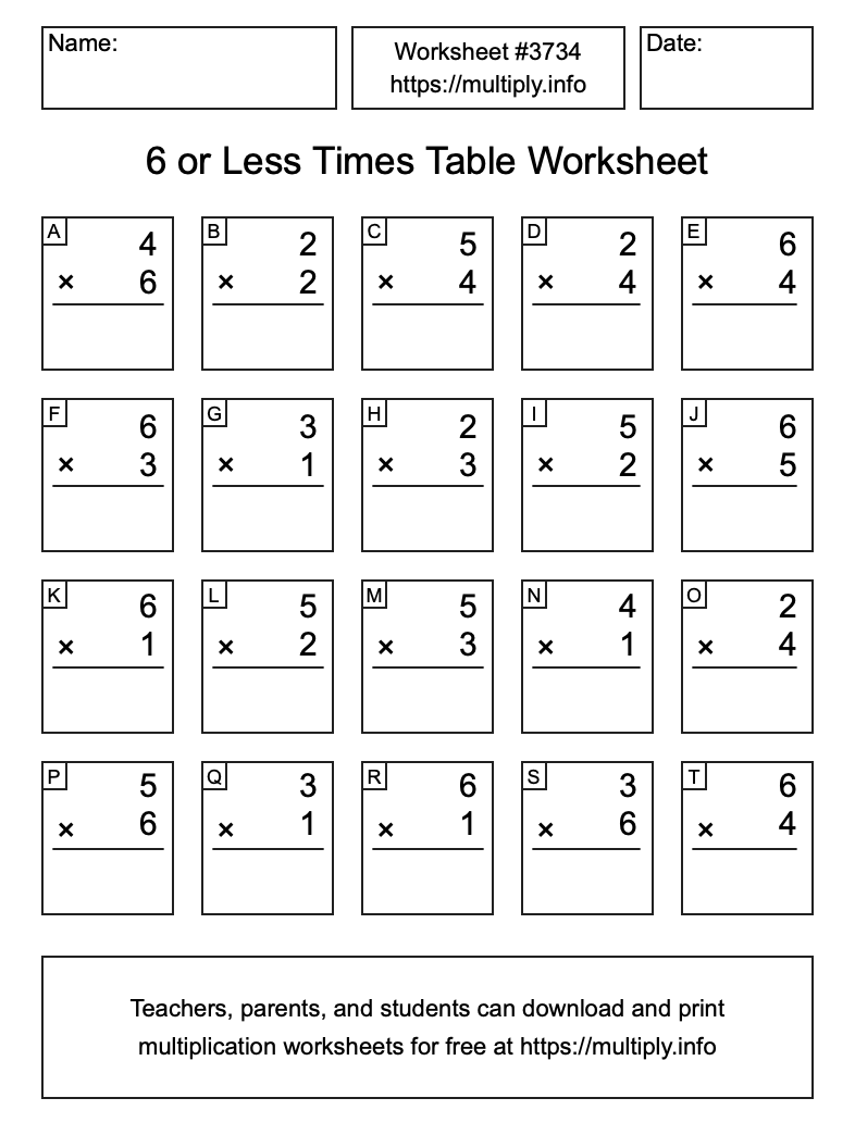 Here is the 6 or less Times Table Worksheet #3734. This worksheet contains multiplication problems where every number in every problem is less than or equal to 6. Print and/or save the worksheet using the buttons below the image. You can also drag or right-click on the image to download it to your device.