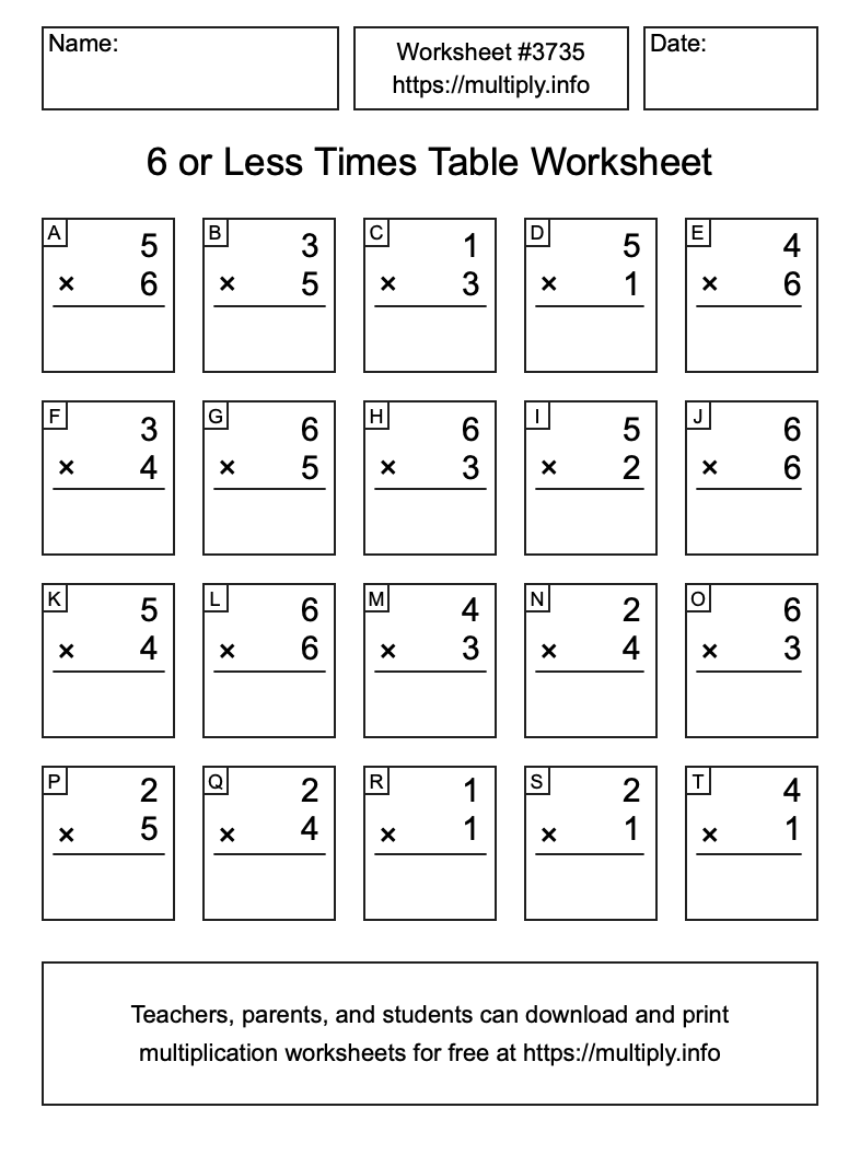 Here is the 6 or less Times Table Worksheet #3735. This worksheet contains multiplication problems where every number in every problem is less than or equal to 6. Print and/or save the worksheet using the buttons below the image. You can also drag or right-click on the image to download it to your device.