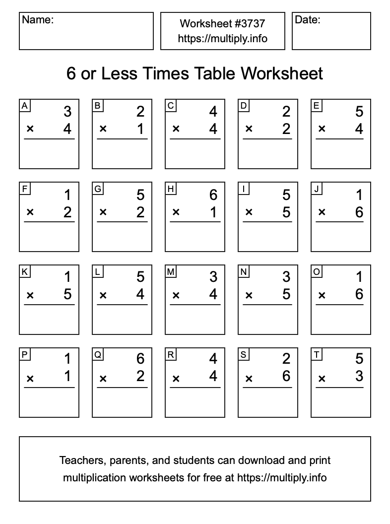 Here is the 6 or less Times Table Worksheet #3737. This worksheet contains multiplication problems where every number in every problem is less than or equal to 6. Print and/or save the worksheet using the buttons below the image. You can also drag or right-click on the image to download it to your device.