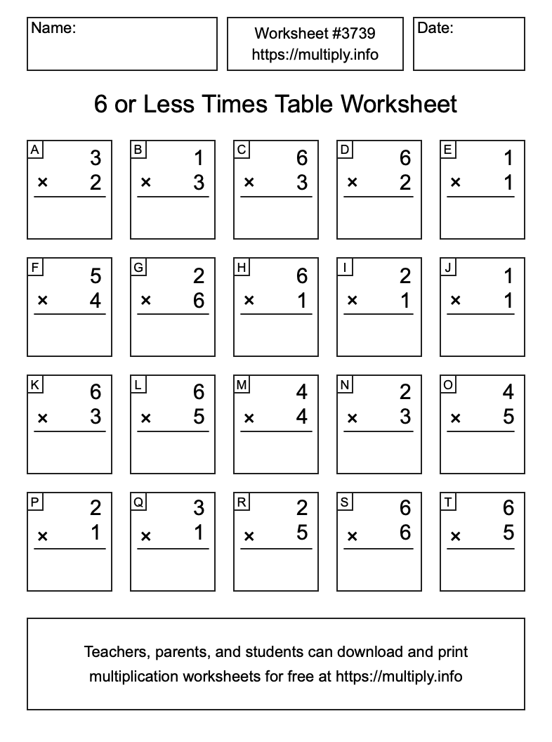 Here is the 6 or less Times Table Worksheet #3739. This worksheet contains multiplication problems where every number in every problem is less than or equal to 6. Print and/or save the worksheet using the buttons below the image. You can also drag or right-click on the image to download it to your device.
