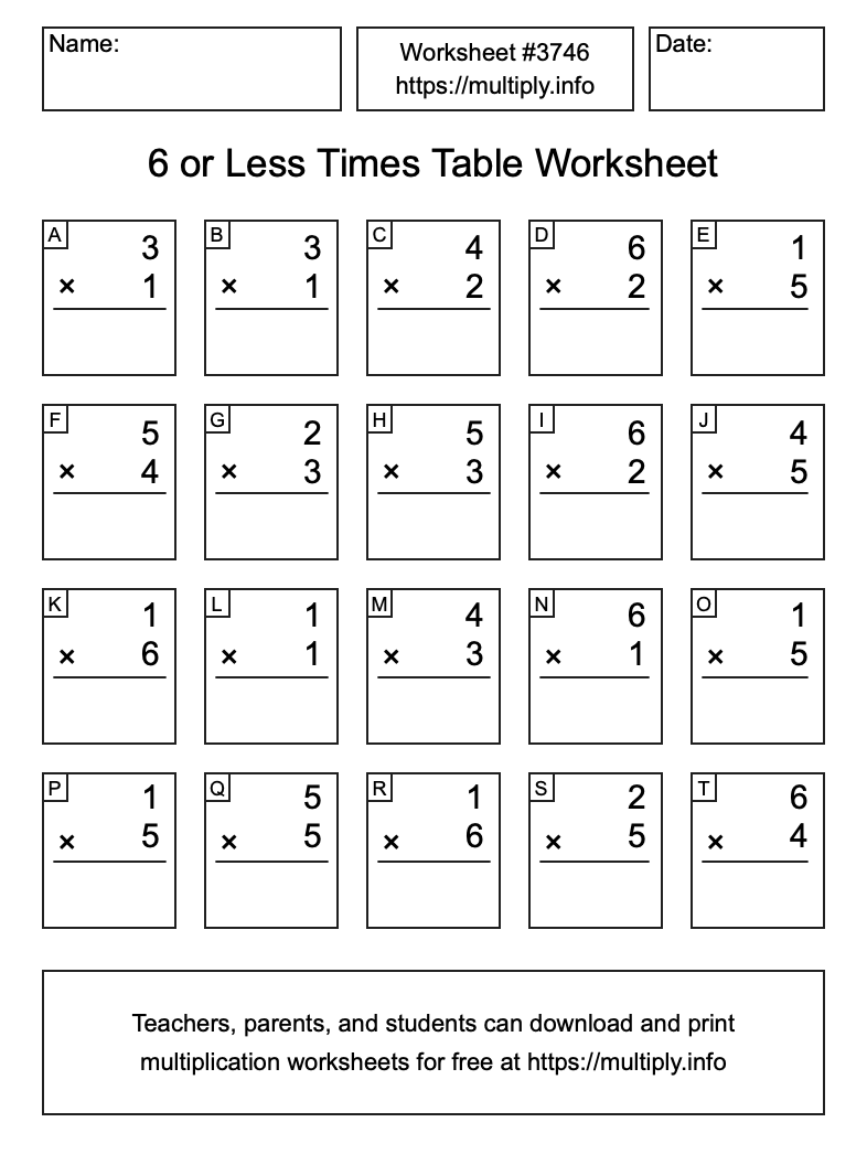 Here is the 6 or less Times Table Worksheet #3746. This worksheet contains multiplication problems where every number in every problem is less than or equal to 6. Print and/or save the worksheet using the buttons below the image. You can also drag or right-click on the image to download it to your device.
