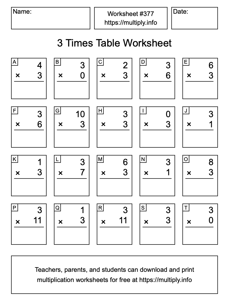 Here is the 3 Times Table Worksheet #377. This worksheet contains problems related to the multiplication table of 3. Print and/or save the worksheet using the buttons below the image. You can also drag or right-click on the image to download it to your device.