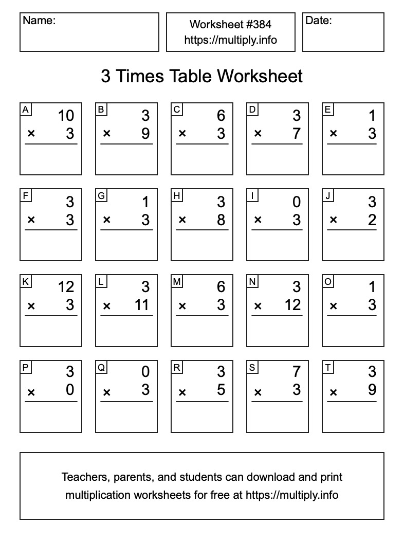 Here is the 3 Times Table Worksheet #384. This worksheet contains problems related to the multiplication table of 3. Print and/or save the worksheet using the buttons below the image. You can also drag or right-click on the image to download it to your device.