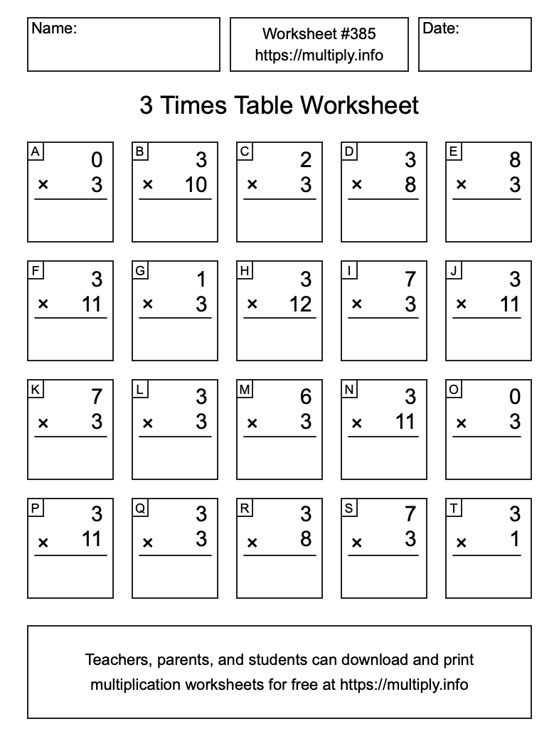 Here is the 3 Times Table Worksheet #385. This worksheet contains problems related to the multiplication table of 3. Print and/or save the worksheet using the buttons below the image. You can also drag or right-click on the image to download it to your device.