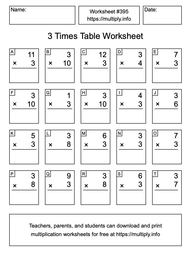Here is the 3 Times Table Worksheet #395. This worksheet contains problems related to the multiplication table of 3. Print and/or save the worksheet using the buttons below the image. You can also drag or right-click on the image to download it to your device.