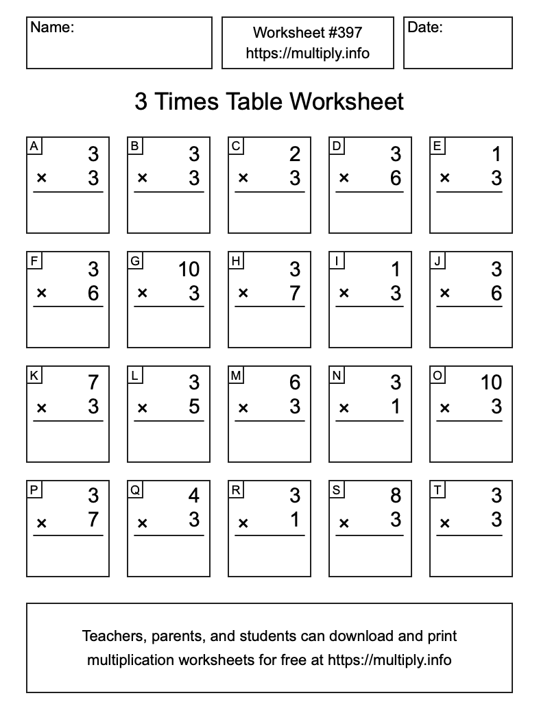 Here is the 3 Times Table Worksheet #397. This worksheet contains problems related to the multiplication table of 3. Print and/or save the worksheet using the buttons below the image. You can also drag or right-click on the image to download it to your device.