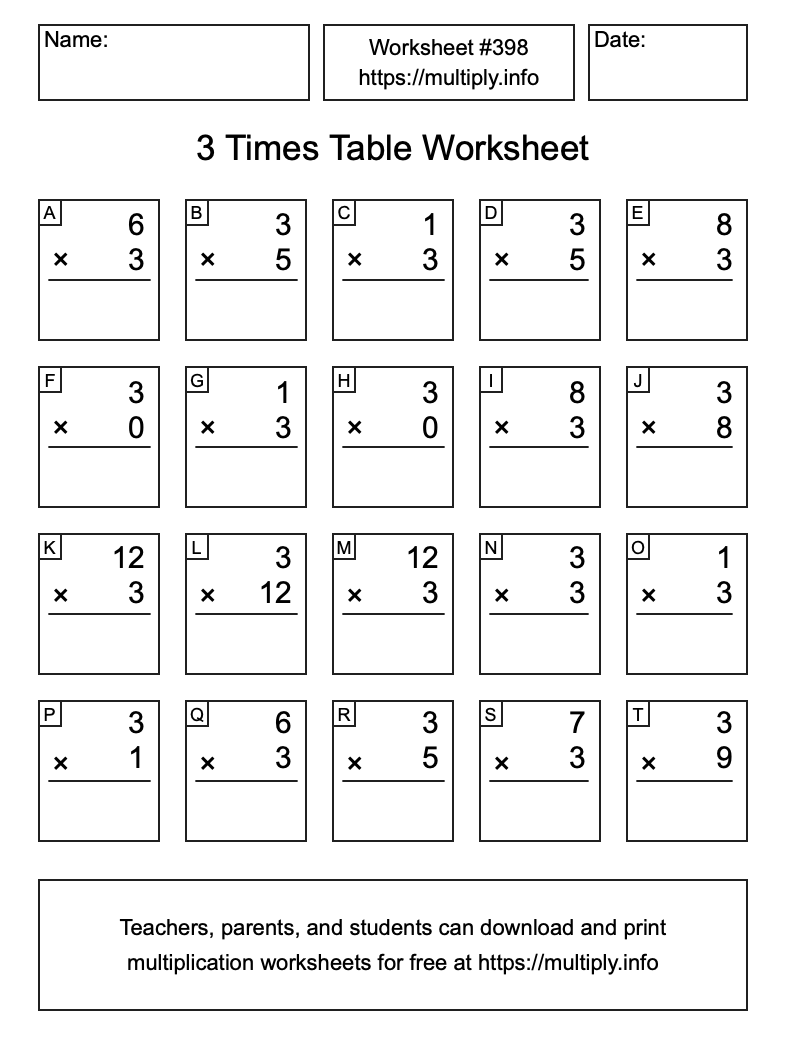 Here is the 3 Times Table Worksheet #398. This worksheet contains problems related to the multiplication table of 3. Print and/or save the worksheet using the buttons below the image. You can also drag or right-click on the image to download it to your device.