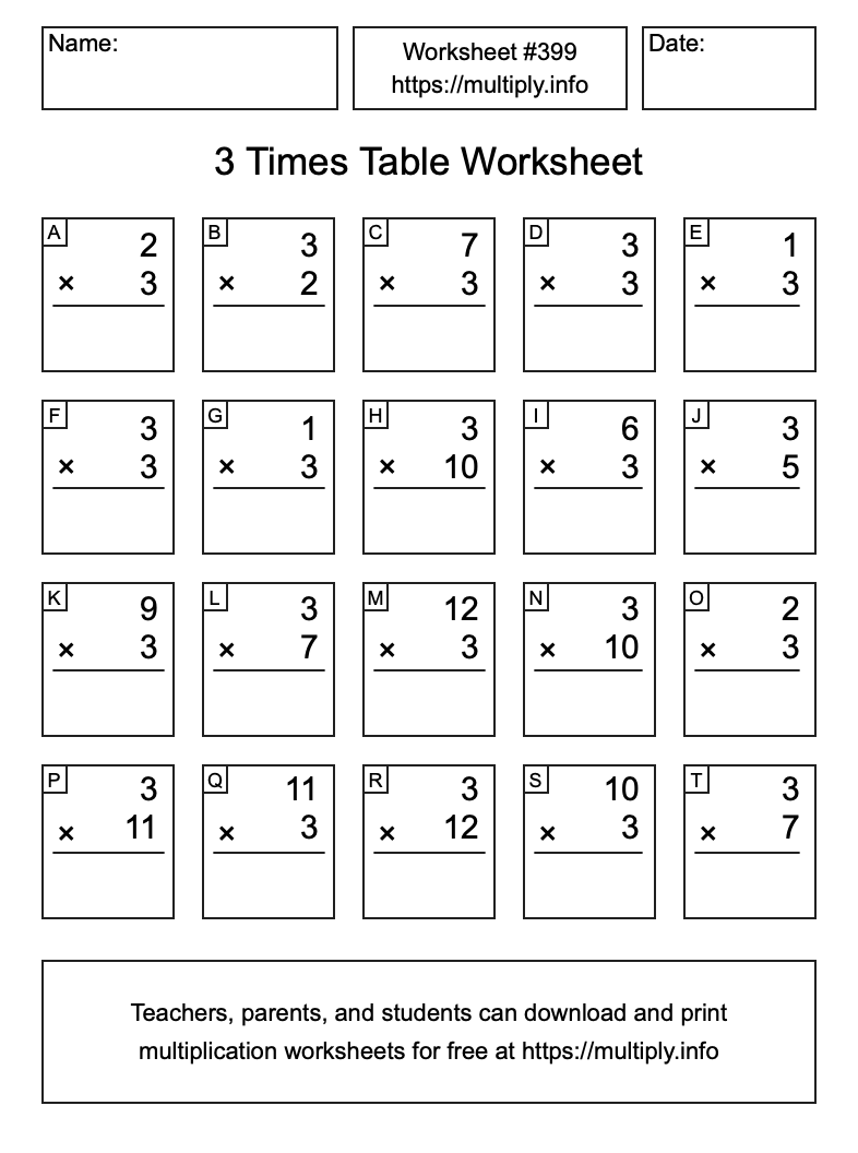 Here is the 3 Times Table Worksheet #399. This worksheet contains problems related to the multiplication table of 3. Print and/or save the worksheet using the buttons below the image. You can also drag or right-click on the image to download it to your device.